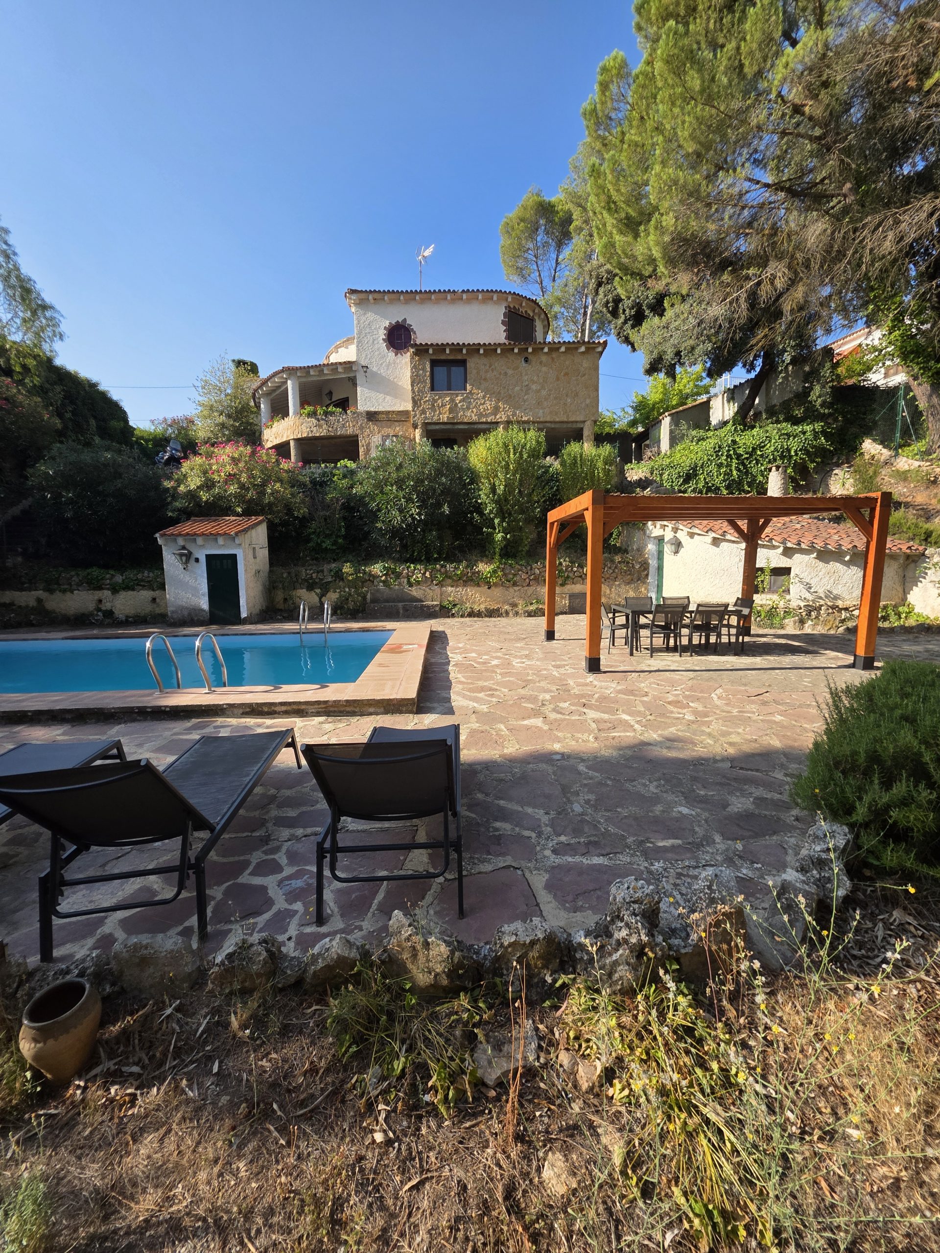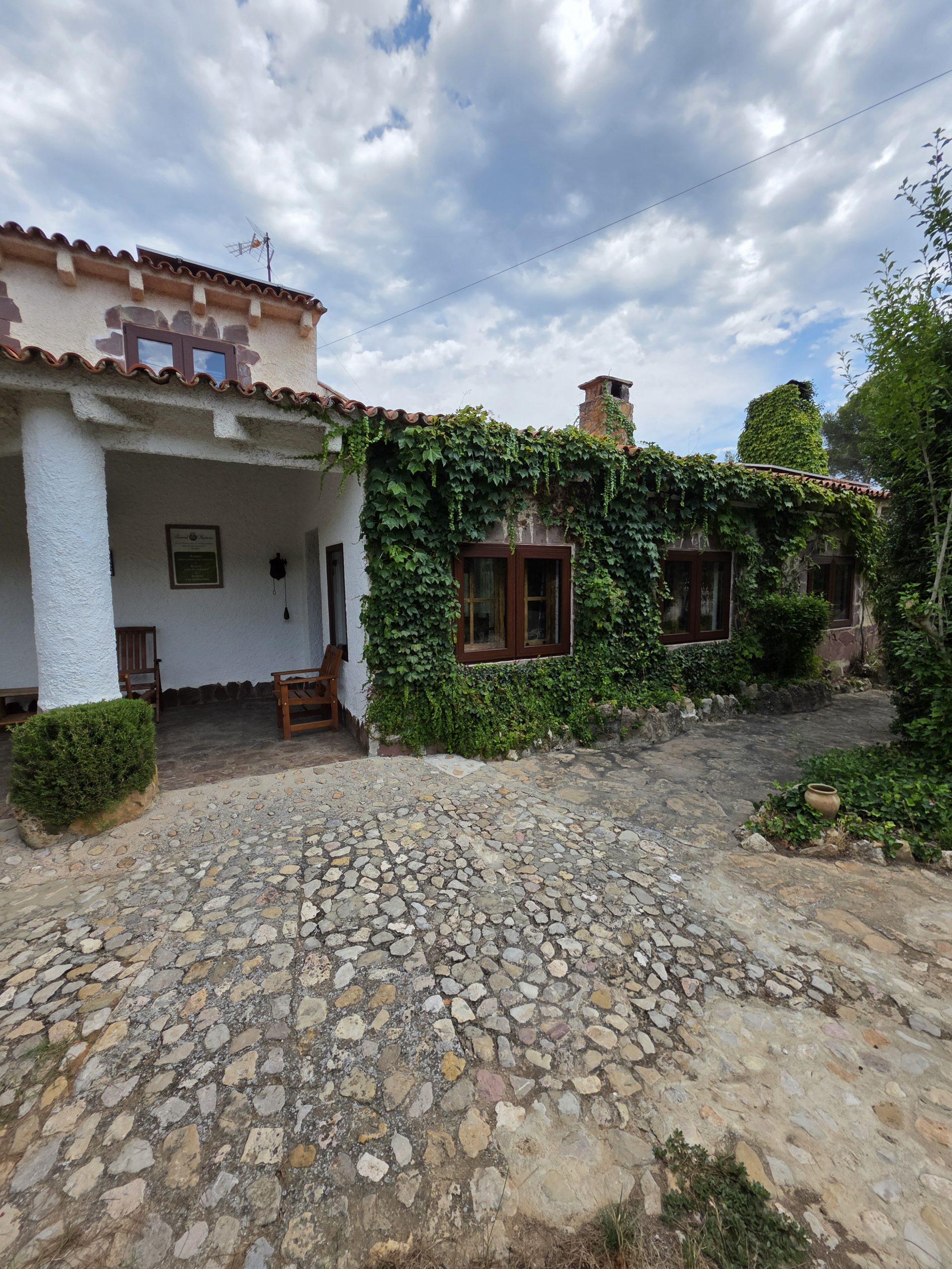 Es una casa con alma llena de rincones especiales: el banco del pinar, la media luna a la puerta de la bodega, la rueda del carro, la mesa de ajedrez, la terraza de los geranios, el sofá de la chimenea…